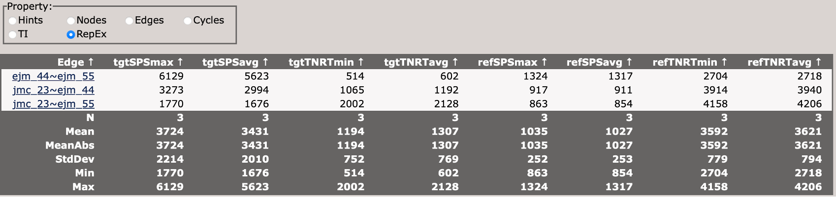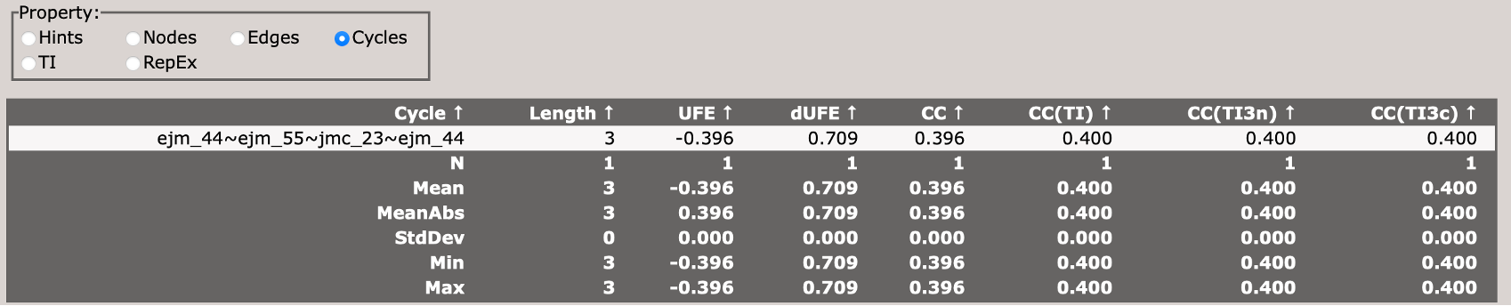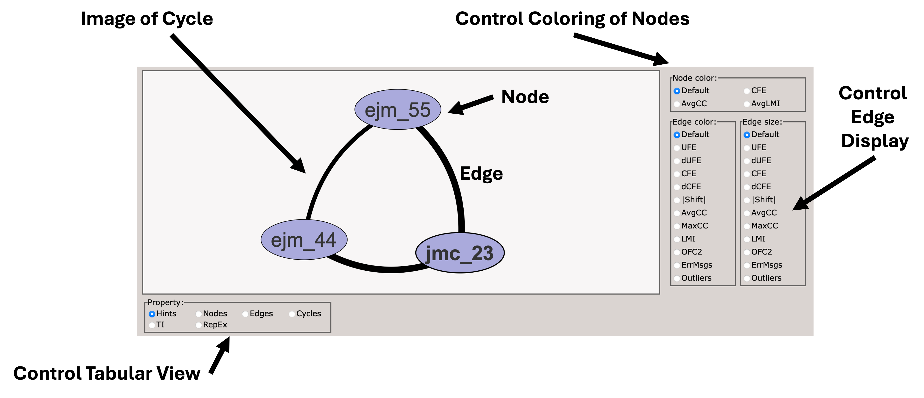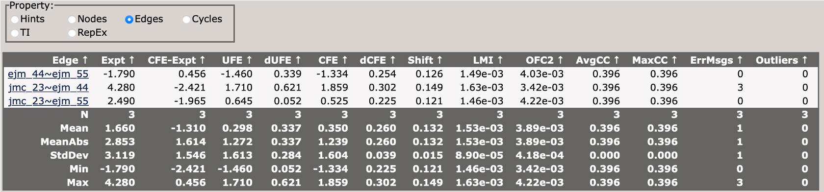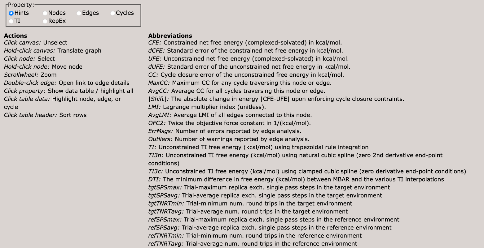When you first load the html file, you will see at the top of the file a map of the RBFE network (in this case three ligands) with a variety of controls.