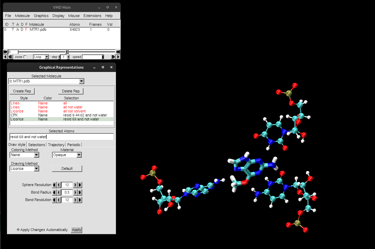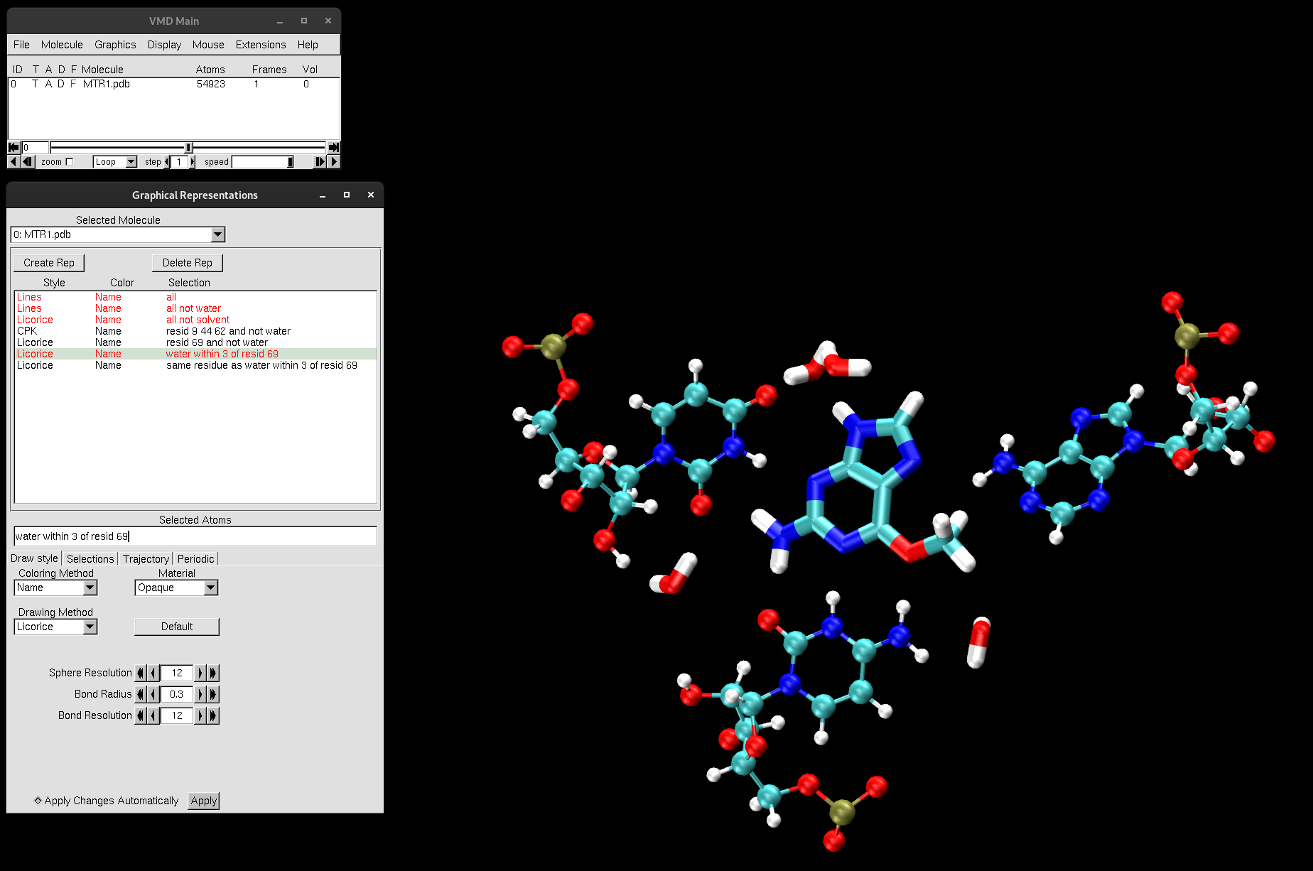Another tool of VMD is to render high-quality images and animations of your system for posters, presentations or publications. We will quickly walk through the steps to obtain a high-quality image on this MTR1 system. First you must set up the scene that you want to display for your high-quality image:
