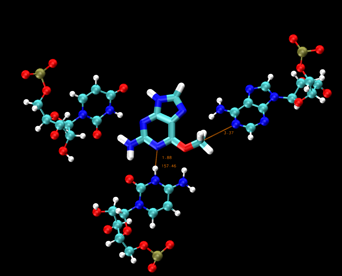 Once you have found these atoms, try to measure the distance between the nucleophile and electrophile (press 2 to initiate bond distance, and find A62:N1 and 69:H6), the bond distance between the protonated cytosine site and the substrate (C9:N3 and 69:N3) and the angle of the atoms involved in the proton transferring from cytosine to the substrate (C9:N3, 69:H13 and 69:N3).