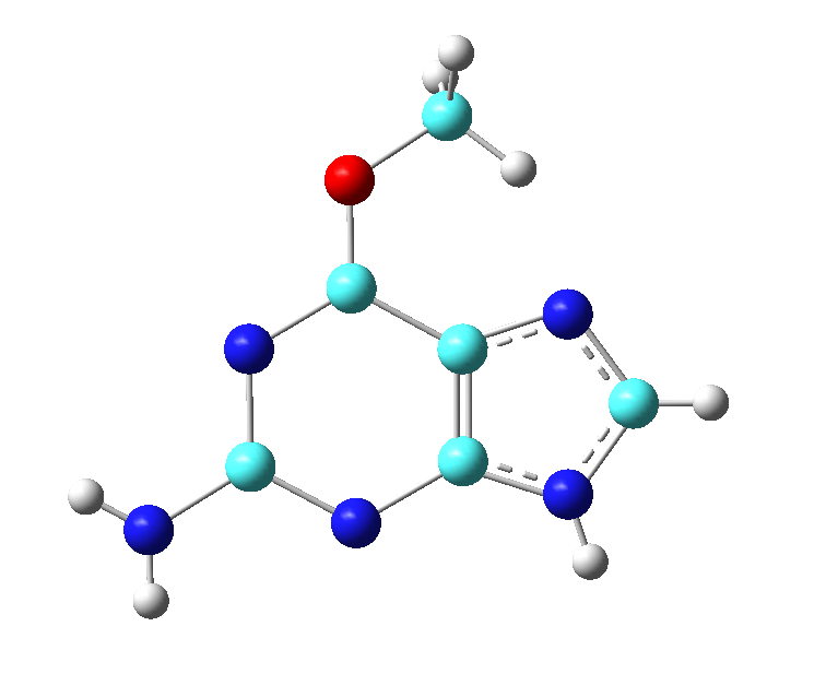 This crystal captures the product state of the ribozyme. We see that adenine 63 is methylated at the N1 position. The ribozyme binds O6 methylated guanine to initiate the reaction, so the reactant state would have the methyl group on guanine and a standard adenine for 63. While in the product state N1 of guanine is protonated, the reactant state O6 methylated guanine does not have a proton at N1. We will hypothesize the source of that proton to be N3 position of C10, meaning the reaction starts with C10 protonated with a +1 charge.