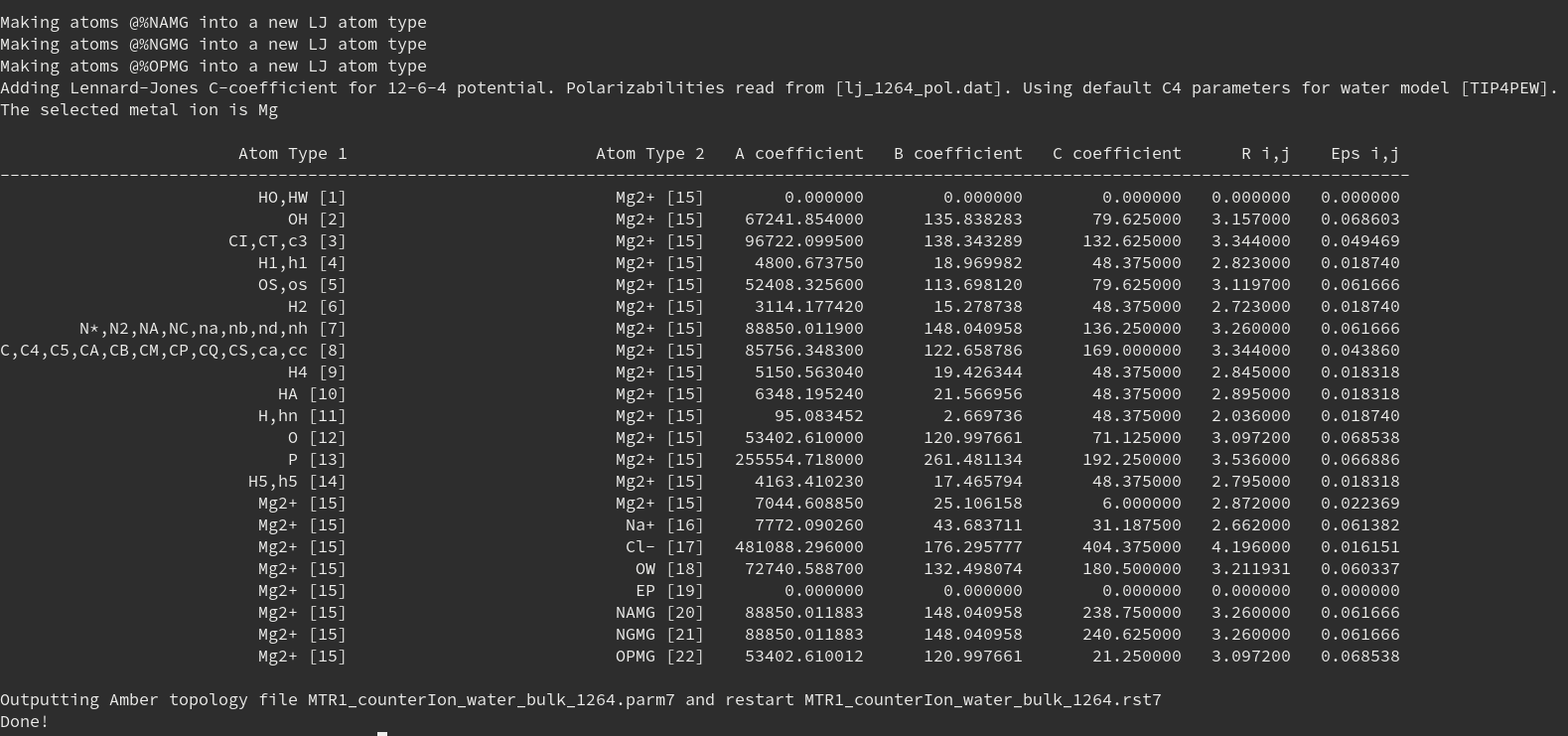 In addition, for pedagogical purposes, we demonstrate how to apply the Panteva 12-6-4 correction terms for magnesium–nucleic acid interactions. Since no magnesium ions were initially present in the MTR1 structure, the original barium ions were replaced with magnesium ions.