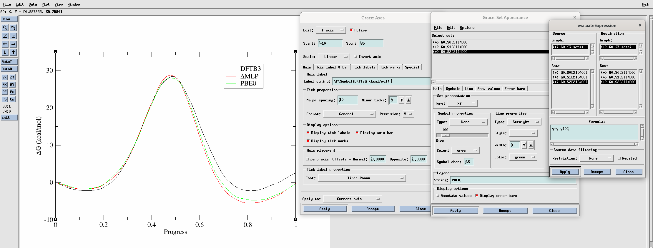 You can adjust the appearance of the plot using the settings shown in the above image. To align the plots such that the free energy of the initial point is zero, go to Data –> Transformations –> Evaluate expression and evaluate y = y - y[0] for each curve. To make the legend, go to Plot –> Set appearance. To modify the axes go to Plot –> Axis properties.